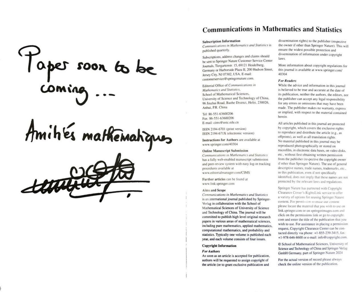 黄文教授向迪米尼-科潘教授介绍了学院总体情况,副院长王毅教授概述了学院国际学术交流与期刊建设进展,概率统计系主任张土生教授介绍了我院概率与统计学科的人才建设与发展现状。座谈中,迪米尼-科潘教授还专门为我院主办的院刊《Communications in Mathematics and Statistics》(Springer出版)亲笔题词。