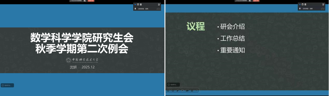中国科学技术大学数学科学学院研究生会于12月13日晚8点在线上召开工作会议,共同回顾了阶段成果并讨论了未来的一些工作。本次会议由现任执行主席沈妍同学主持,研究生会全体成员共同参加。会议在融洽而务实的氛围中展开,系统回顾了近期工作成效,并对下一阶段的发展方向进行了交流。