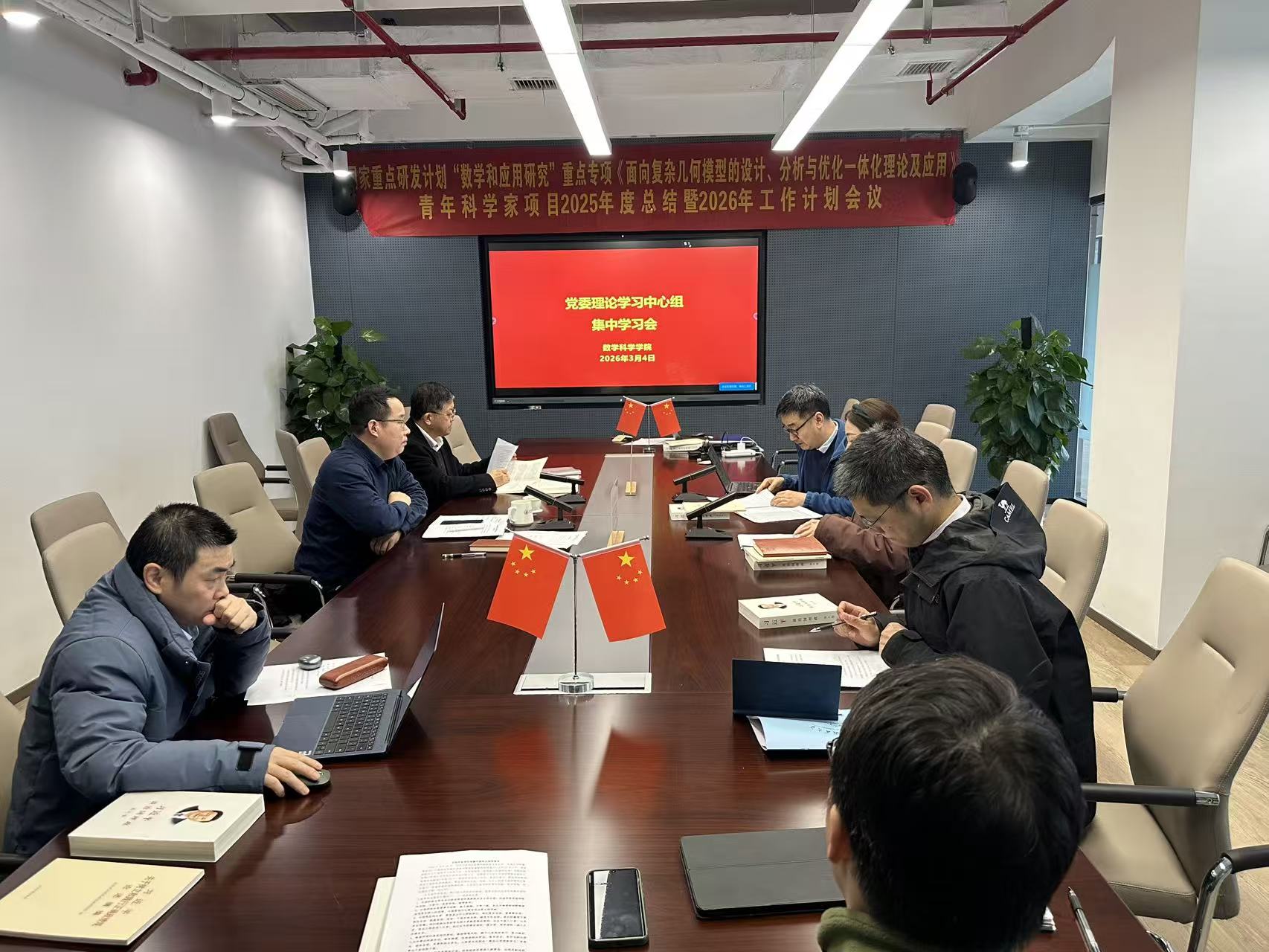 2026年3月4日下午,数学科学学院党委理论学习中心组在新楼208会议室开展集中学习会。学院领导班子、党委委员参加会议,会议由院党委书记左达峰主持。