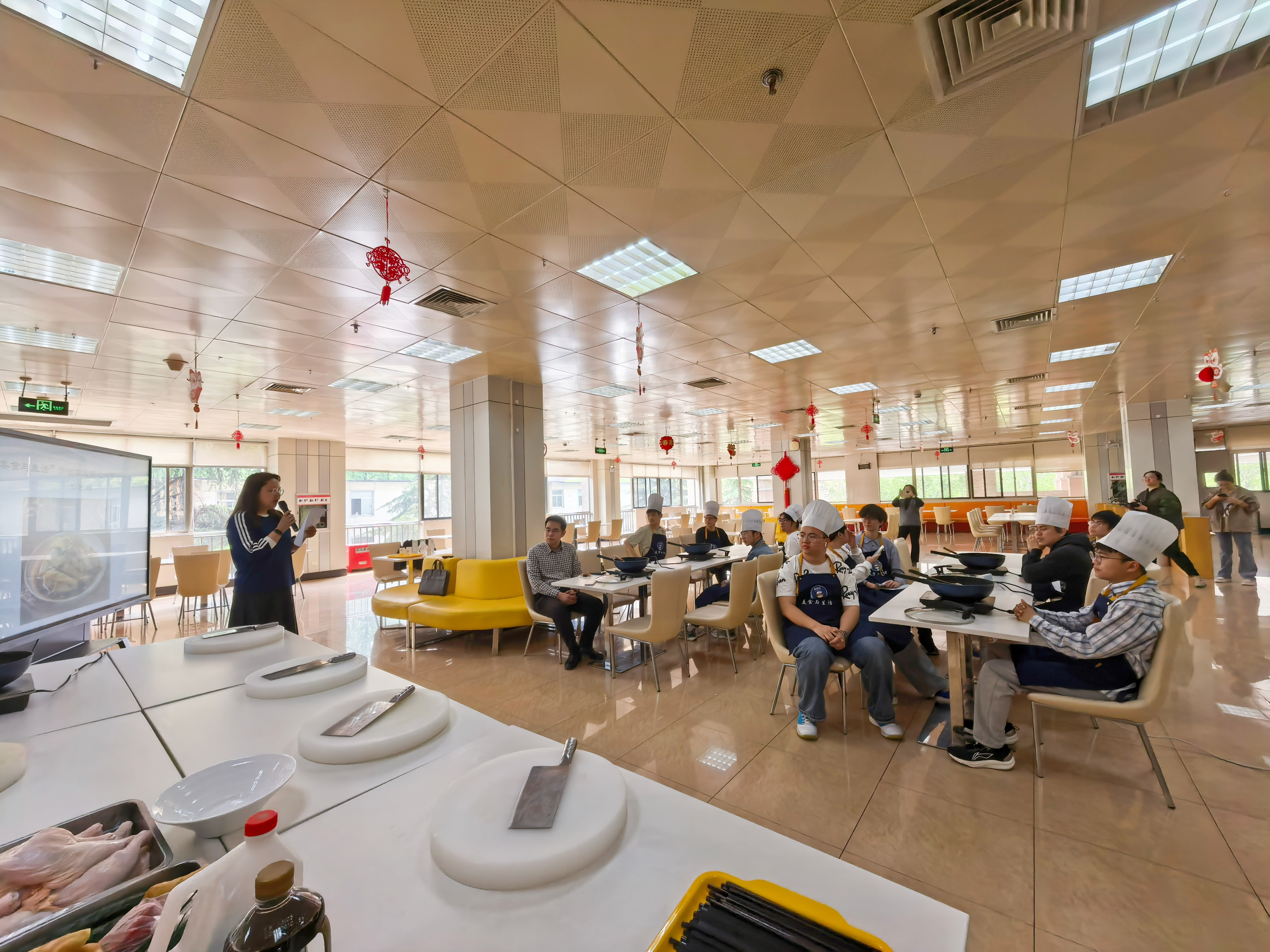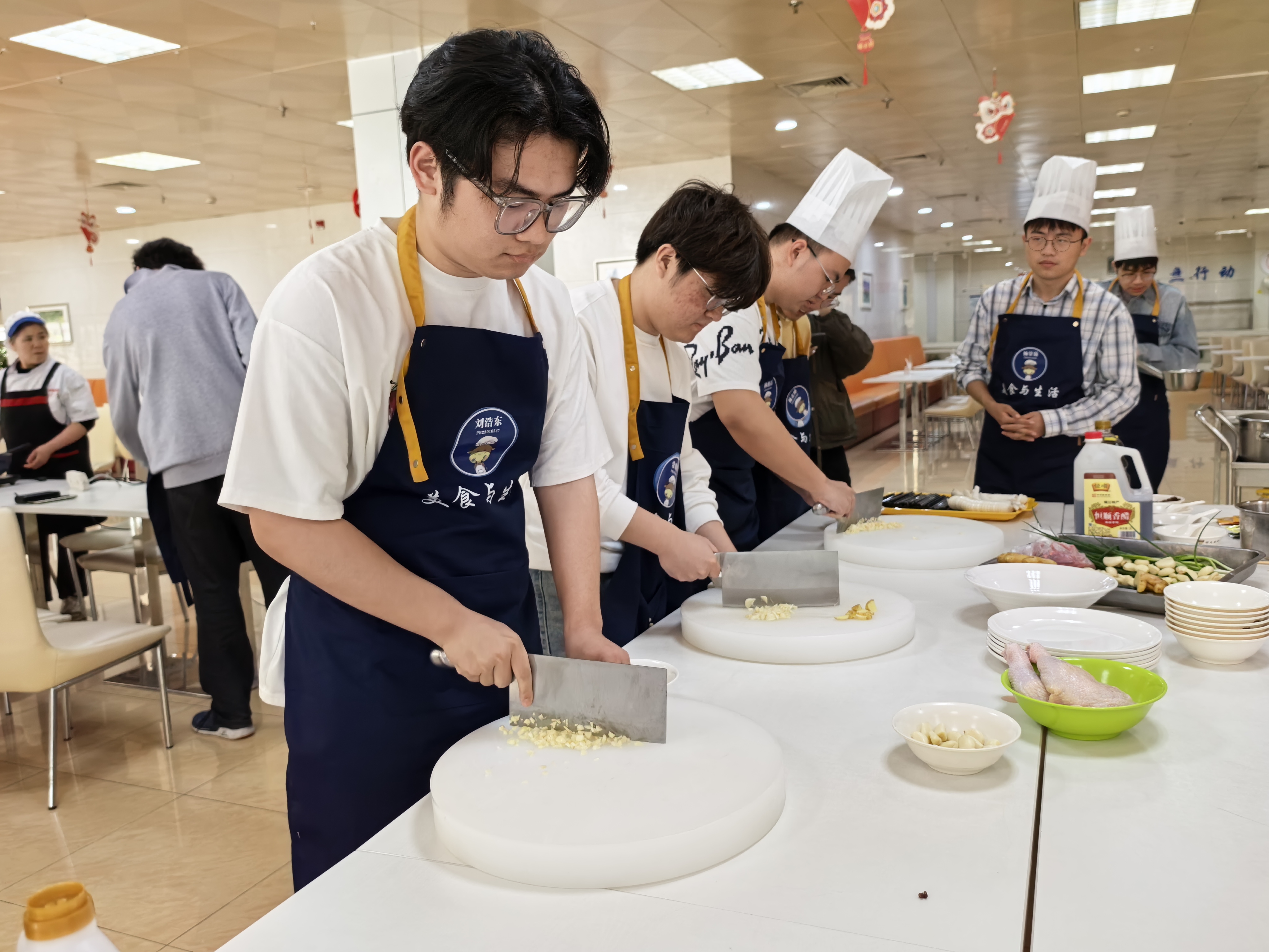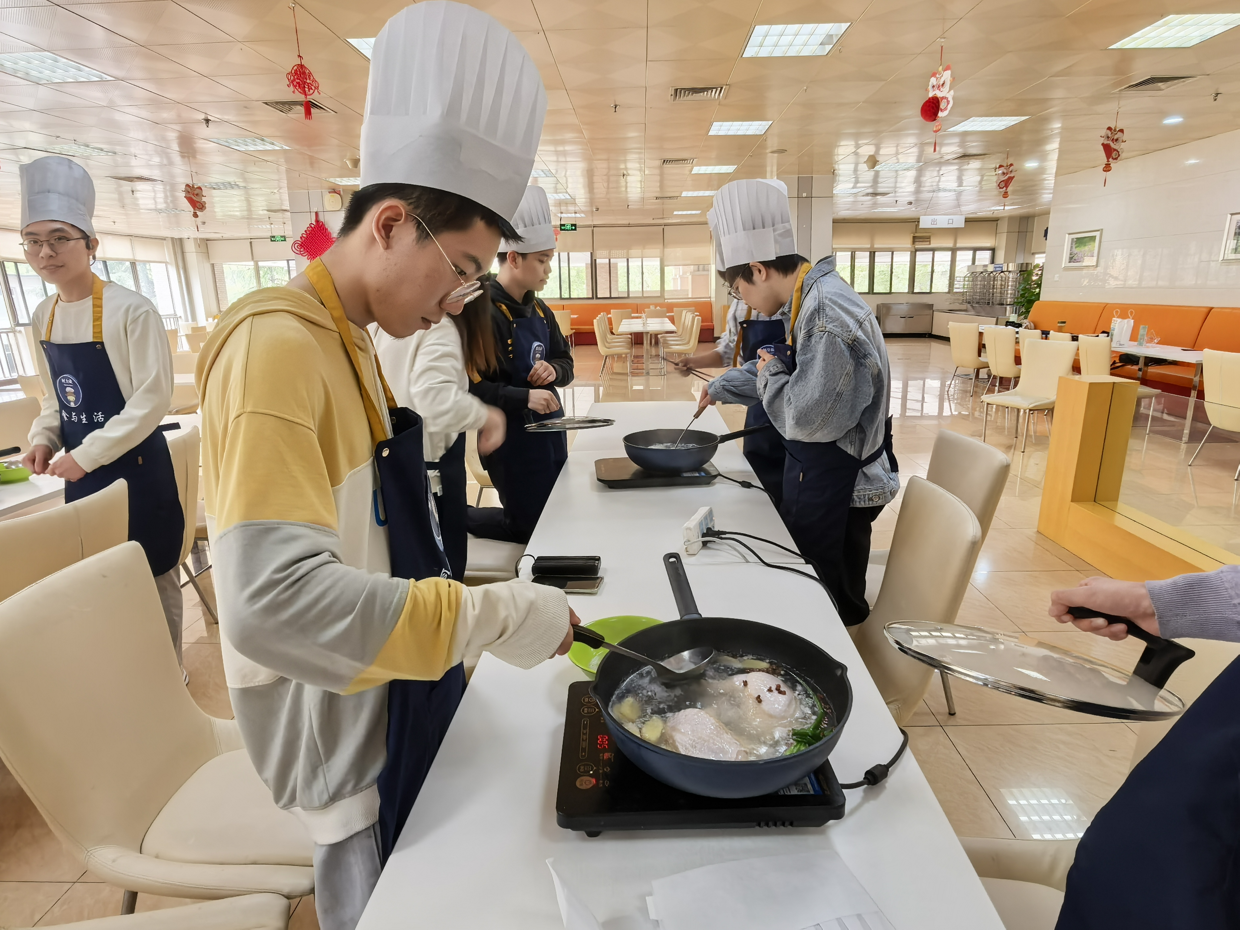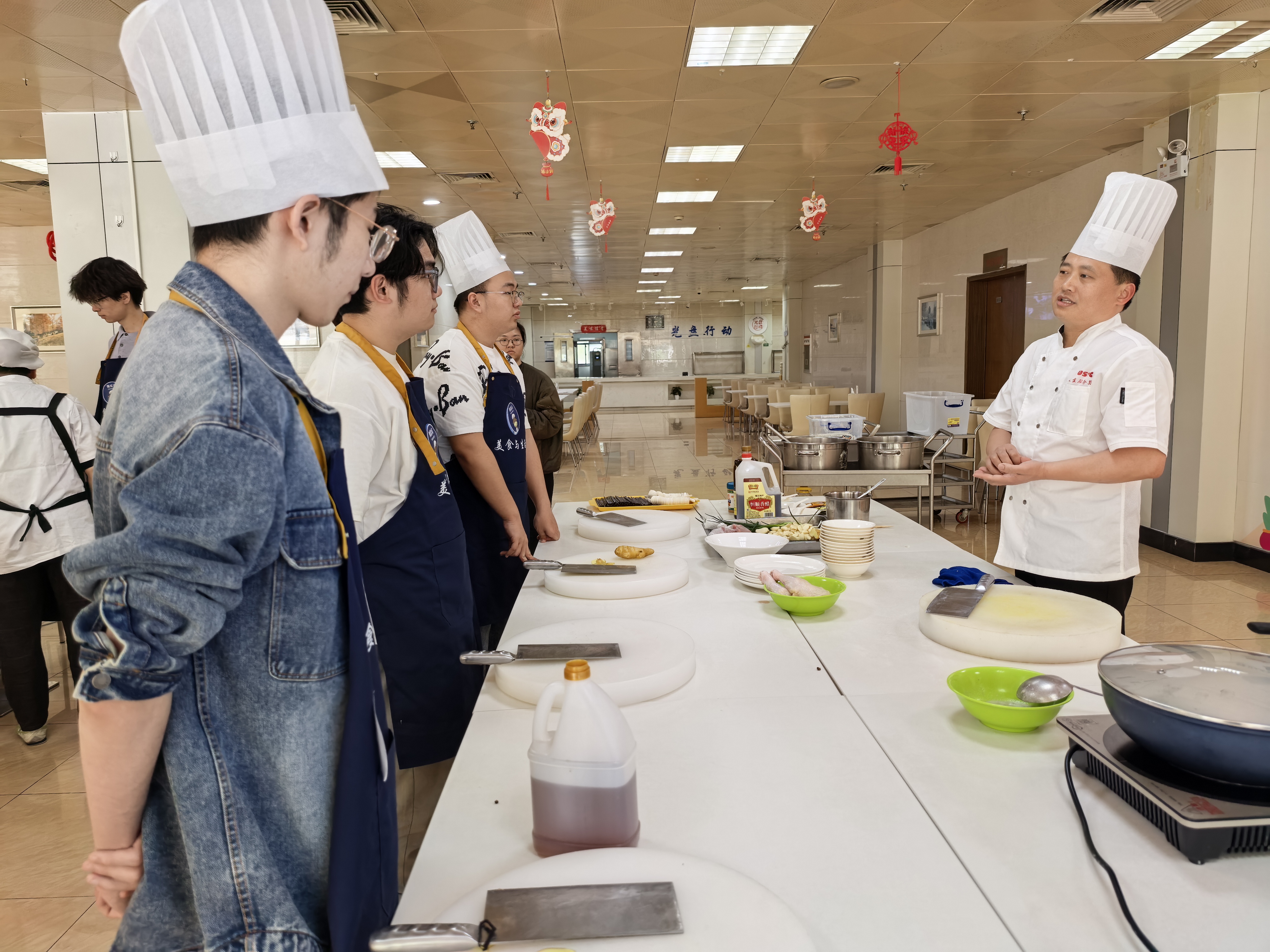 近日,数学科学学院2023级本科2班20余名同学走进由饮食服务集团主办的“美食与生活”劳动实践课堂,学习制作传统川菜“口水鸡”,在锅碗瓢盆的交响中感受劳动乐趣,于烟火灶台间体悟劳动之美。饮食服务集团直属党支部副书记、副总经理张静出席本次活动,与同学们亲切交流。
