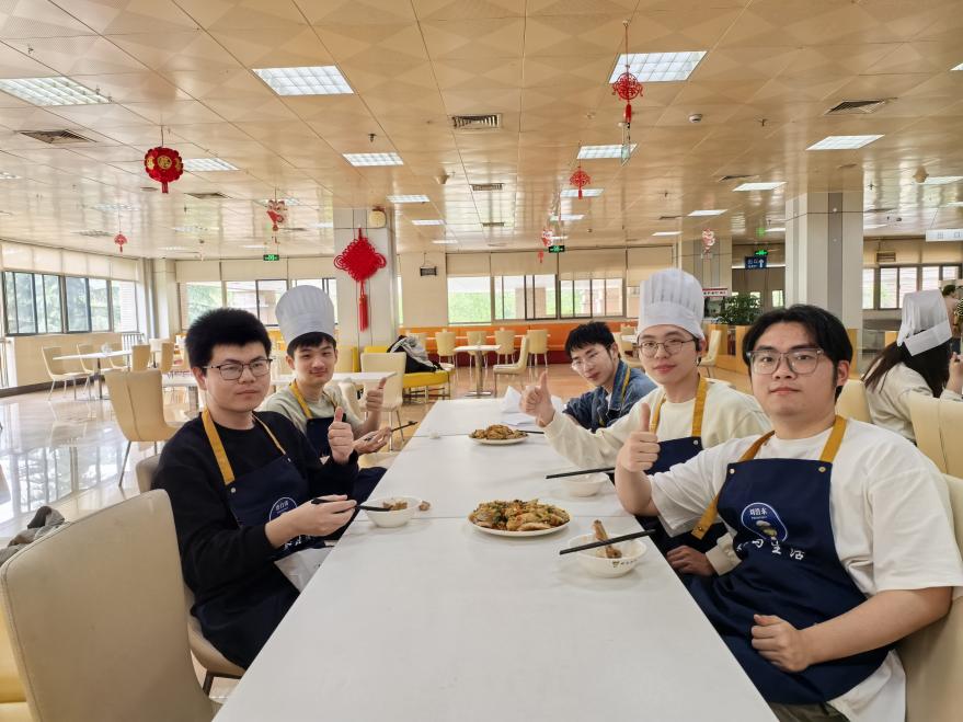 在厨艺教学环节,东区教工餐厅副经理杨俊老师为同学们详细拆解了口水鸡的制作流程。从鸡腿的煮制技巧,再到切鸡、切黄瓜丝、摆盘浇汁等细节,杨老师一一悉心讲解并示范操作。值得一提的是,本次课堂制作的口水鸡不仅是一道经典川菜,其名称还据传与中国科学技术大学首任校长郭沫若在《賟波曲》中的记述有关。郭老笔下“口水”二字,既描绘了这道菜令人垂涎欲滴的魅力,也为这道川菜增添了一份独特的“科大气息”。劳动实践课堂通过“文化讲座+现场烹饪+菜品展示”的多元形式,让同学们在学习烹饪技艺的同时,进一步增强了对中华饮食文化的认同感与自豪感。