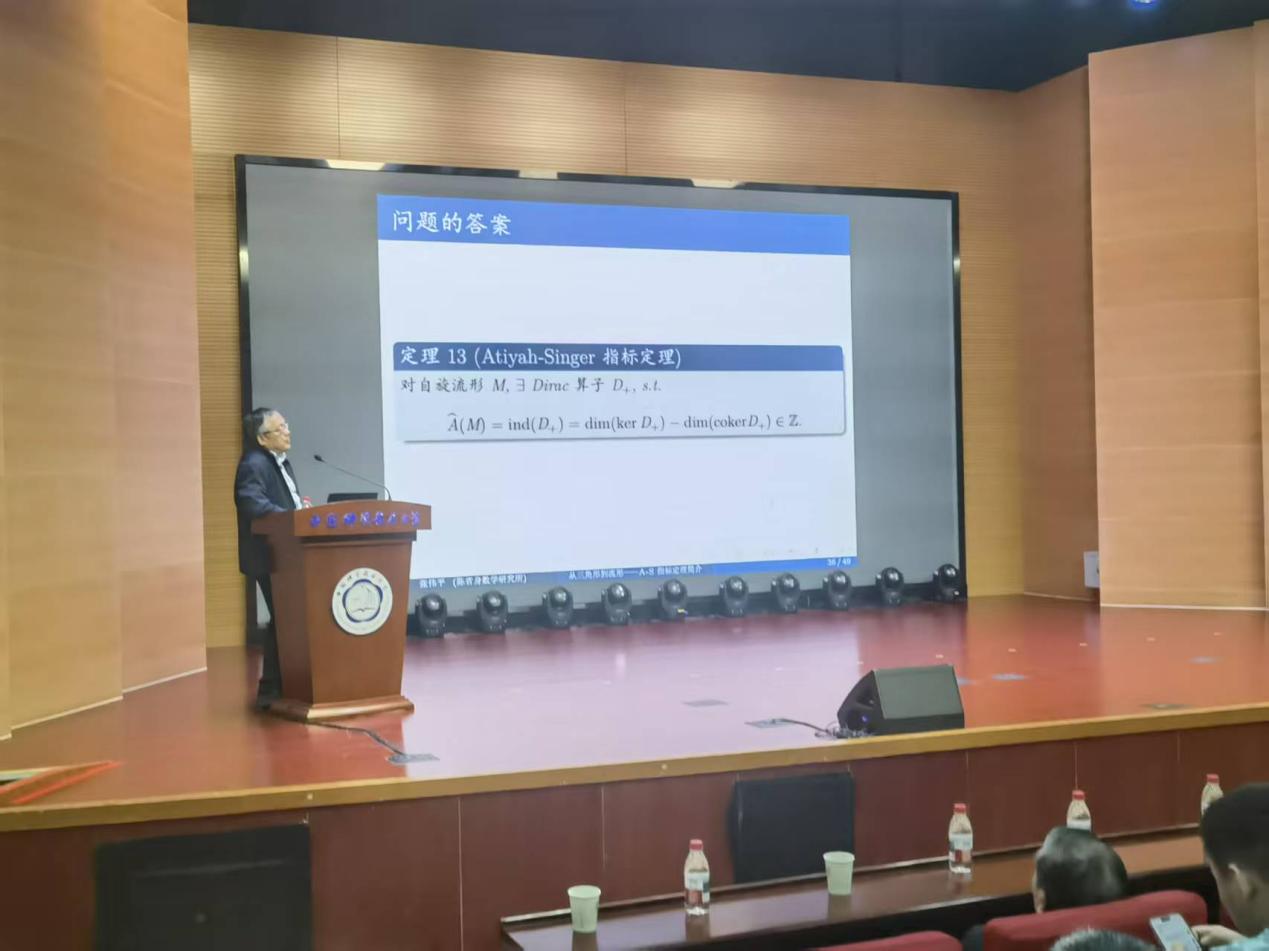报告核心聚焦Atiyah Singer 指标定理。张伟平院士介绍,该定理由Atiyah 与Singer 建立。它统一Gauss-Bonne-Chern定理、Hirzebruch 符号差定理、等经典结论,实现分析指标= 拓扑指标的深刻对应,将椭圆微分算子的解析指标用流形与向量丛的示性类表示,是20 世纪数学最具统一性的核心定理之一。