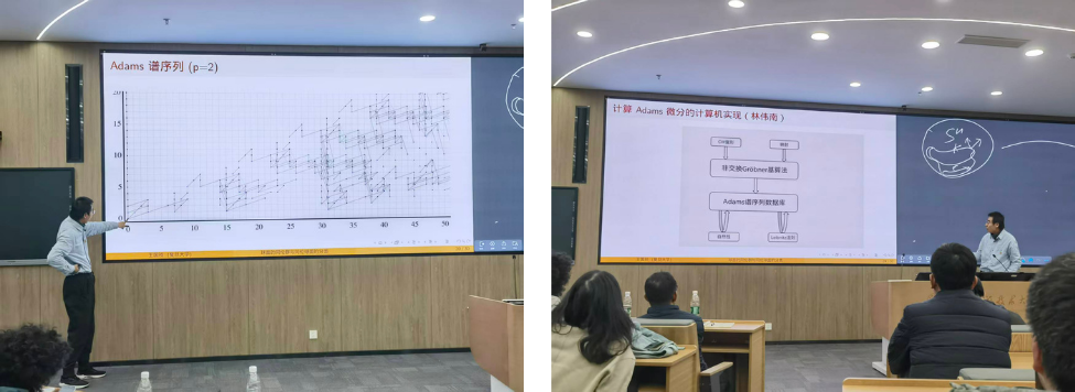 随后,王国祯教授重点讲解了Kervaire不变量及其在9维怪球构造中的关键作用。为深入探讨球面微分结构受维数影响的机制,他引入Adams谱序列这一重要工具,说明其在计算不同维数球面上微分结构类别与数量中的核心功能。最后,王国祯教授分享了与合作者在此领域的最新进展,展示了形式化证明在Adams谱序列计算中的有效应用。