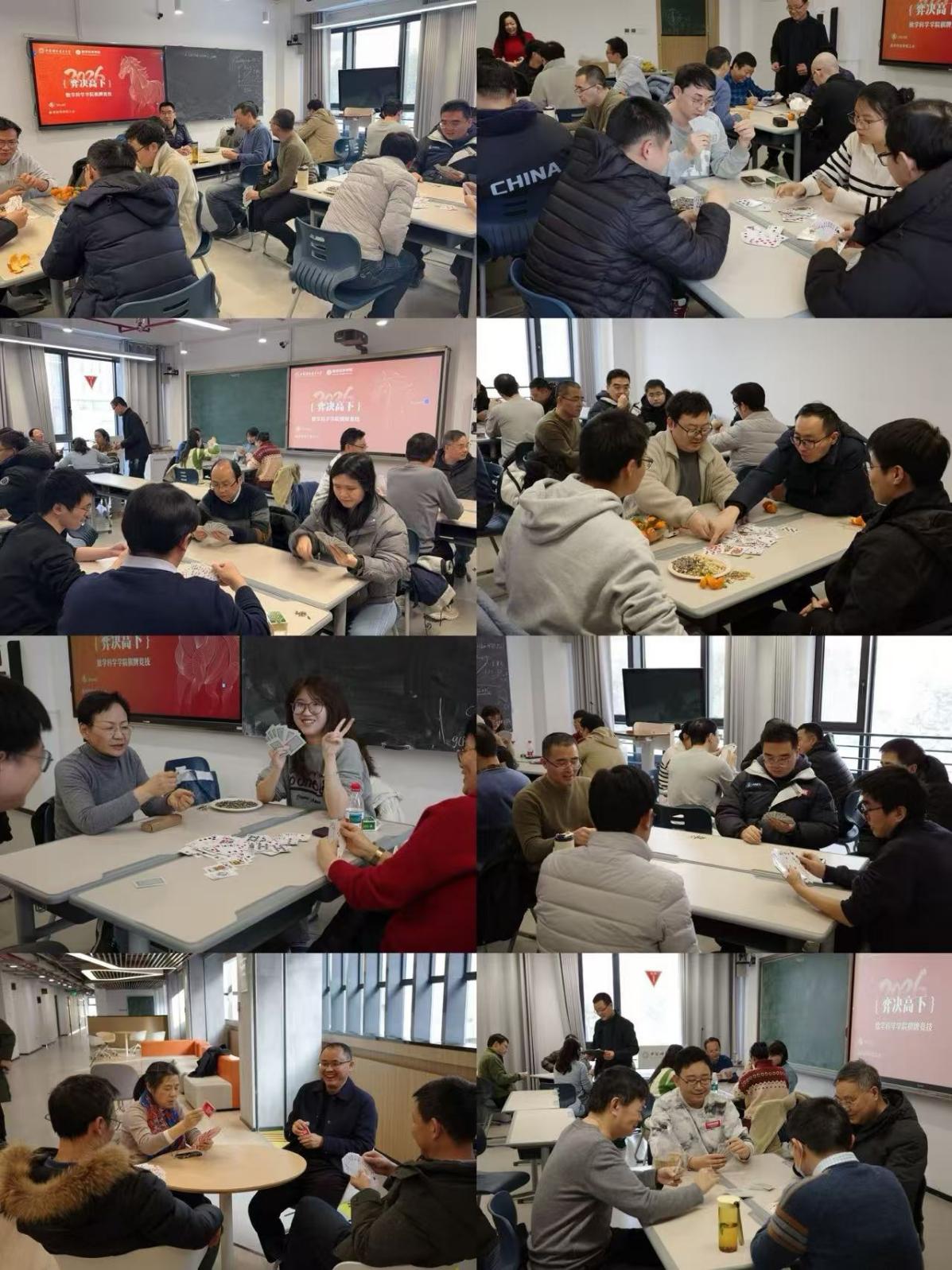 下午2:30,老师们陆续到场,合影时笑容灿烂,期待满满。比赛采用自由组队形式,既有常年搭档的“黄金组合”,也有临时配对的“新鲜尝试”。出牌时的果断决策,防守时的眼神交流—数学人严谨的逻辑思维,在牌局中展现出别样的生动与趣味。围观老师时而低声分析,时而为精妙打法由衷赞叹,现场气氛既专注又活泼。
