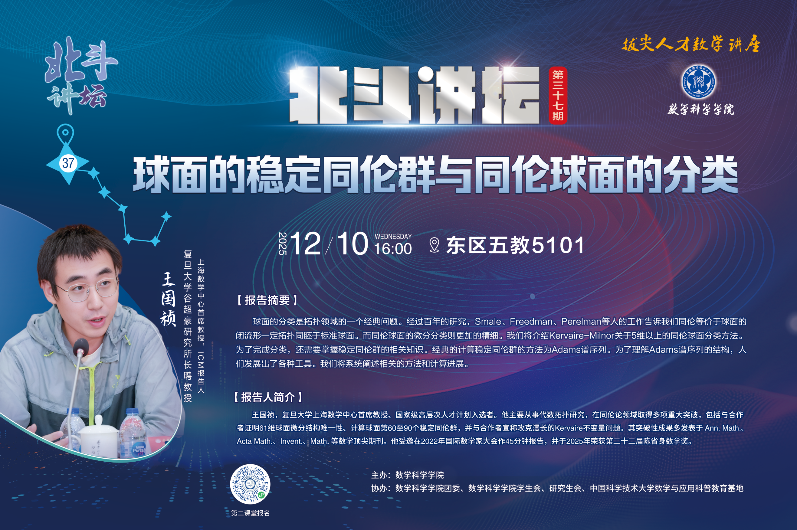 12-10【王国祯】五教5101 北斗讲坛第37期:球面的稳定同伦群与同伦球面的分类